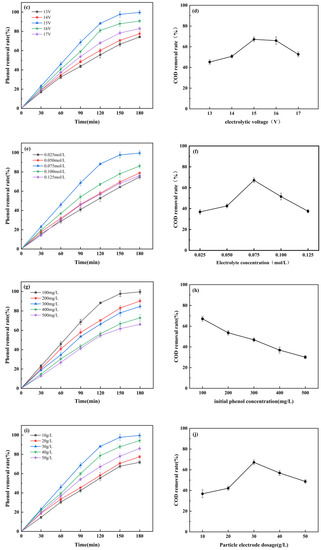 (a,b) Effect of initial pH; (c,d) electrolytic voltage; (e,f) electrolyte concentration; (g,h) initial phenol concentration; (i,j) particle electrode dosage on the removal of phenol and COD.