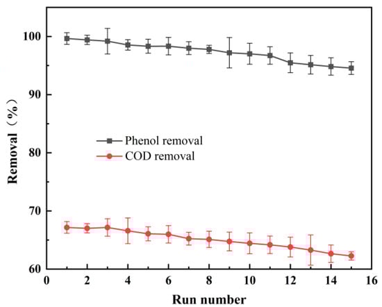The simulated phenol wastewater with an initial concentration of 100 mg/L was electrolyzed under optimal conditions. Specifically, the initial pH was 3, the electrolytic voltage was 15 V, the concentration of the electrolyte (Na2SO4) was 0.075 mol/L, the particle electrode dosage was 30 g/L, and the reaction time was 3 h. The electrolyzation was repeated 15 times to measure the phenol concentration and COD in the effluent. The results are shown in Figure 6.