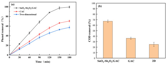 As shown in Figure 7, after three hours of degradation under the same conditions, the removal rates of phenol and COD in the 3D electrode system were higher than that in the 2D electrode system. The removal rates of phenol and COD in the 3D electrode reactor filled with SnO2-Sb2O3/GAC particle electrodes increased by 31.68% and 42.26%, respectively, compared with the blank GAC 3D electrode reactor. In addition, the removal rate of phenol and COD in the 3D electrode reactor filled with SnO2-Sb2O3/GAC particle electrodes increased by 30.98% and 42.14%, respectively, compared with the 2D electrode reactor. This can be mainly attributed to the filling particle electrodes increasing the surface area of the reaction, causing phenol to be rapidly adsorbed to the surface of the particle electrode in the initial duration, which led to electrocatalytic oxidation. In addition, numerous phenol components were removed in a short time. Meanwhile, adding particle electrodes greatly shortened the mass transfer distance between electrodes and organic pollutants, which contributed to faster mass transfer.