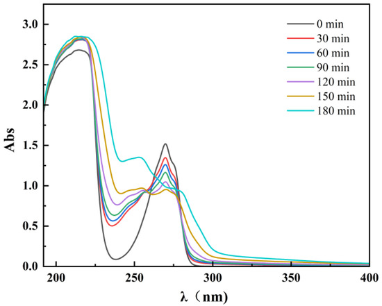 To understand the degradation characteristics of phenol, phenol was treated under the optimal experimental conditions determined in the above experiment. The water sample was scanned by full-wavelength ultraviolet to plot the ultraviolet–visible absorption spectrum, as shown in Figure 8.