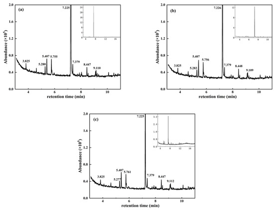 The intermediate products during phenol degradation were analyzed by gas chromatography–mass spectrometry (GC-MS). The water samples were collected at the degradation time points of 60 min, 120 min, and 180 min and then analyzed by GC-MS. In addition, the Agilent DB-5 capillary column (30 m, 0.25 mm, and 0.25 μm) was used in the GC-MS analysis. The analysis was performed at the column temperature of 30 °C (for 1 min), which was raised to 150 ℃ at 10 °C/min, and then raised to 300 °C at 12 °C/min (for 5 min). The capillary column was set as the carrier gas source, with the flow rate being 1 mL/min. The EI ionization source was used as the mass spectrometry detector, with the ionization voltage being 70 eV, the ionization source temperature being 230 °C, the quadrupole being 150 degrees, and the charge-to-mass ratio within 30–550 m/z. The analysis results are shown in Figure 9.