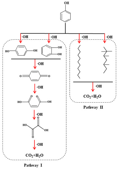 The possible degradation routes of phenol were analyzed and discussed according to the analysis results of intermediate products during phenol degradation. In the 3D electrode system, the possible degradation of phenol can be divided into two routes. The first route was that ·OH attacked phenol and oxidized it to benzoquinone and polyhydroxy phenols. Subsequently, ·OH continued to react with carbon–carbon double bonds to form an addition reaction. After that, the benzene ring was opened to form small molecular organic acids, which were mineralized to form CO2 and H2O. The second route was that phenol was directly ring-opened under the action of ·OH to form unstable chain products, such as heptane, and then degraded into CO2 and H2O. According to the analysis of this section and the results of other studies [34,35,36], the main degradation routes of phenol can be inferred, as shown in Figure 10.