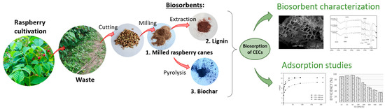 Different biomaterials such as lignin from black liquor, tea waste, olive stones, eucalyptus bark, corn cob, bamboo chips, bagasse fly ash, olive mill waste, etc., have been investigated for the removal of CECs from water [77,78,79,80,81,82,83].