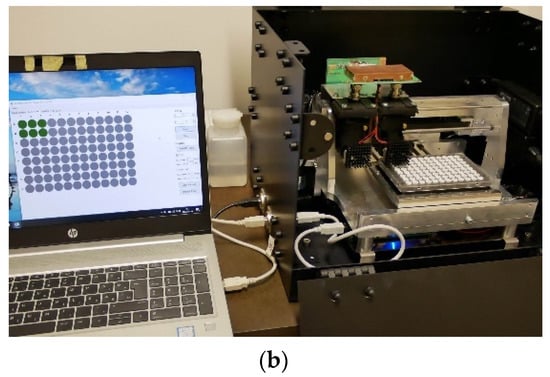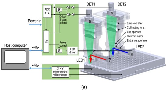 Block scheme (a) and implementation (b) of the dual-head Dichroic Fluorometer System equipped with a dichroic mirror to reflect the visible input light beam (red and blue arrows from the LED1 red and LED2 blue LED sources, respectively) and pass the fluorescent output light beam (green path) to the corresponding DET1 and DET2 detectors, as well as a motorized X × Y stepping apparatus for reading fluorescent signals in individual wells of a 96-well microplate. The instrument is microcontroller (uC)-controlled; the detector signal is digitized by a multichannel analog-to-digital converter (ADC).