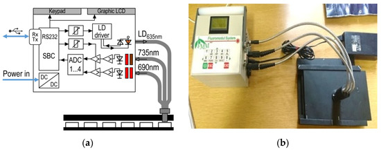 Block scheme (a) and image (b) of the FluoroMeter Module equipped with a microplate holder for reading fluorescent signals in individual wells of a 96-well microplate: laser diode (LD), 2-channel by 2-stage organized amplifiers (>), multichannel analog-to-digital converter (ADC1…4), single-board computer (SBC), switching power converter (DC/DC), liquid crystal display (LDC), RS232 transmission line with receive (Rx) and transmit (Tx) lines.