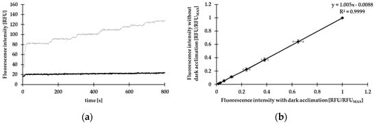Comparisons of fluorometric tests obtained using microplates of different colors (a) and without or with dark acclimation before the measurement (b). (a) The reflection of black (black line) and white (gray line) microplates upon illumination, applying gradually increasing light intensity over time. (b) Correlation of the normalized (RFU/RFUMAX) fluorescence signals measured with (abscissa) or without (ordinate) dark acclimation prior to illumination. Data are presented as mean ± standard deviation on both the abscissa and ordinate. Fluorescence intensity is determined in relative fluorescence units (RFUs).