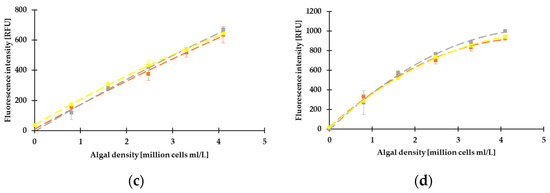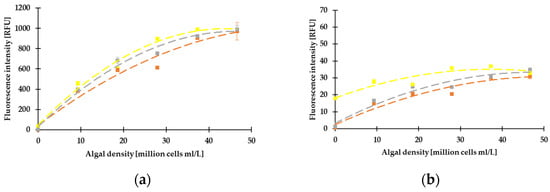 The correlation between signals of R. subcapitata samples obtained with and without dark acclimation is shown in Figure 3b. As experiments were performed in triplicates, for better comparison of data obtained from the three individual experiments, the mean ± standard deviation of normalized (RFU/RFUMAX) fluorescence intensity values are presented in Figure 4b. RFUMAX refers to the fluorescence intensity detected for the algal suspension with the highest cell density. The two datasets are demonstrated as being equivalent to each other based on the levels of the signals (relative to the corresponding maximal signals) and because they are strongly correlated with each other based on their coefficients of determination (r2) not differing significantly from 1. Based on these findings, it is concluded that the use of dark acclimation has no effect on the magnitude of the fluorescence signal obtained. Thus, no dark acclimation was applied prior to the experiment. It can be explained by the characteristic of instruments, i.e., they operate with continuous excitation with no saturation pulses. The whole measurement process shortens and the sedimentation of algae in microplate wells does not result in the instability of analytical signals. Detection stability can be determined based on the Fo [72], and can be decreased by continuous stirring of samples. Endpoint-induced fluorescence-based algal density detection methods offer the advantages of high detection sensitivity (due to highly specific signal generation) and good detection stability (due to the endpoint detection mode). Moreover, in this study, we applied both fluorescence-based instruments for characterizing the PSII photosystem of algal species in a given time (e.g., as endpoint in ecotoxicity assay), and not for continuously monitoring the system status over extended periods; thus, detection stability has not been an uncertainty factor.