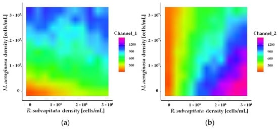 The fluorescence signals of the algal mixtures detected by DFS are shown in Figure 5, where Channel 1 excited at 630 nm and emitted at 708 nm, while Channel 2 excited at 470 nm and emitted at 716 nm. Figure 5a indicates that signal intensity on Channel 1 increased with the increase in the number of blue-green and green algal cells. It shows, however, a stronger increase with the growth of the blue-green algae. With the growth of M. aeruginosa, it reached nearly 1200 RFU, but only around 600 RFU with R. subcapitata. Figure 5b shows that the fluorescence signal did not increase with the increase in M. aeruginosa when R. subcapitata was present at low concentrations. The signal showed a strong increase with increasing concentrations of R. subcapitata cells, reaching a maximum of around 1500 RFU. However, at high M. aeruginosa concentration, the signal showed a weaker increase with the increase in green algal cell concentration. At high R. subcapitata cell concentrations, the fluorescence signal decreased with the parallel increase in M. aeruginosa. Microcystis sp. and R. subcapitata differ from each other in their pigment compositions and arrangements, which indicated differences in their spectral fluorescence properties, which were utilized by the DFS (Figure 5) [18].