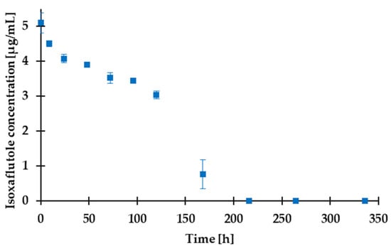 Isoxaflutole is increasingly being used as a replacement for atrazine, a herbicide that was widely used until it was banned in the EU in 2004. In turn, isoxaflutole has been reported as a potential emerging water pollutant both in the U.S. and in the EU [43,44], and it has also been reported for its algal toxicity [48]. To ensure the accuracy of algal toxicity tests, the stability of the compound during the test was verified by determining the differences in the degradation of isoxaflutole in distilled water and Z8 medium, the preferred medium for culturing Cyanobacteria. The results showed that no apparent degradation of isoxaflutole was observed in distilled water within 2 weeks, while the degradation was practically complete within 8–14 days in Z8 medium. Complete degradation of the active ingredient was measured at the 216th hour of the experiment (Figure 6).