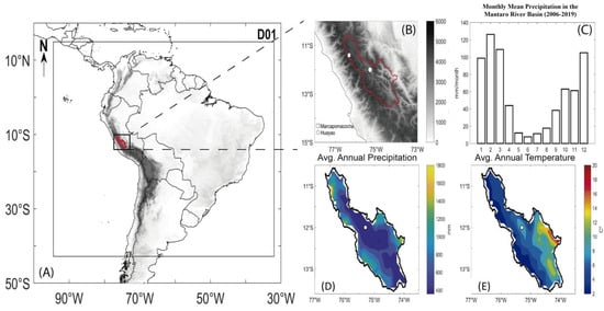The MRB is located in the central Peruvian Andes (10°34′–13°35′ S, 73°55′–76°40′ W), covering a drainage area of 34,550 km2 at a mean altitude of approximately 3870 m a.s.l. The annual mean precipitation over the basin during the 2006–2019 period showed values of approximately 1100 mm (Figure 1B). The seasonal precipitation cycle shows a marked response to the South American Summer Monsoon (SASM), where 83% of the annual rainfall takes place between October and April and precipitation is almost absent during austral winter (Figure 1C). The spatial variability of mean temperature throughout the year varies between 2 and 20 °C, following the insolation forcing over the southern hemisphere. Minimum temperatures show a larger seasonality, varying from 0.5 °C in the winter season to 7 °C during the summer season. Mean maximum temperatures, on the other hand, show a less pronounced seasonality, ranging from 20.8 °C in November to 18.4 °C in the winter season [].