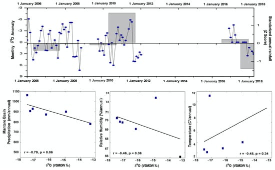 Top panel: Time series of monthly δ18O anomalies (blue dots and line) and standardized annual rainfall calculated for the hydrological year in the Mantaro Basin (gray bars). Bottom panel: Scatter plots between amount-weighted annual isotopic composition against annual local environmental parameters: precipitation (left panel), relative humidity (middle panel), and temperature (right panel). Black line represents the linear regression.