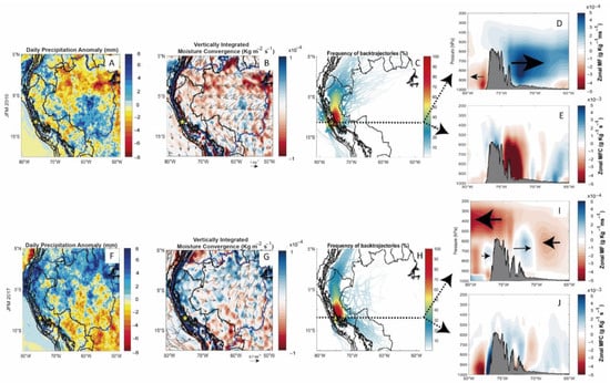 Regional atmospheric circulation during the extreme events in the summers (January, February, and March) of 2010 (top panels) and 2017 (bottom panels). (A,F) Daily mean precipitation anomalies, (B,G) vertically integrated moisture flux and wind vectors, (C,H) frequency of back-trajectories in percent, (D,E,I,J) zonal cross-sections of moisture flux and moisture flux convergence along latitude of the Huayao and Marcapomacocha stations, respectively.