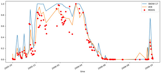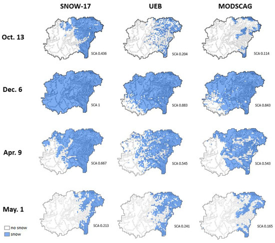 Figure 3), shows that both models generally follow the observed SCA pattern. During the snow accumulation period, the SNOW-17 model tended to have higher peaks (e.g., during October and November) and overestimate the SCA more than the UEB model does. During the melting period, both models simulated the snowmelt process with reasonable timing and amount compared to the observational data. The binary snow-cover maps (