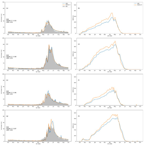 Figure 6 present the simulated domain average SWE and observed and simulated discharge in different water years (1994, 1997, 2001, and 2008) for the Dolores River and Blue River watersheds, respectively. These years were chosen because they were typical of and spanned the range of model performance over the two decades (22 years), except for one year that was exceptionally dry and where there was a poor model performance from both models (water year 2002). These results show that the two snow models coupled to SAC-SMA and Rutpix7 provide reasonable discharge simulations for the two watersheds, each of which had different snowmelt and discharge patterns.