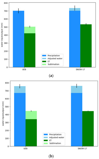 Figure 7). Precipitation adjustments made to SNOW-17 through the SCF parameter, and to UEB through the drift factor parameter, are shown. Precipitation inputs to both snowmelt models were adjusted by a similar amount in the Blue River watershed, whereas only the SNOW-17 model was adjusted in the Dolores River watershed, noting from the calibration section above that the drift factor was not adjusted when the SCF was less than 1.2. Since the simulated precipitation inputs are similar and the models were calibrated against the same observed discharge, both model configurations have similar total evaporative components for each of the watersheds. The UEB model, however, explicitly simulated the portion due to sublimation. The results show that the water loss due to sublimation is a considerable amount (12–13% of annual mean precipitation), and it should not be neglected in the snow mass balance for these watersheds.