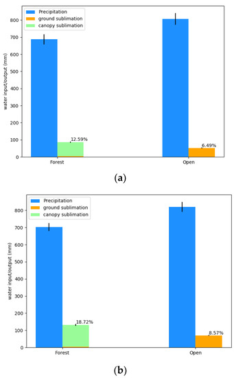 Figure 8). This figure shows the watershed average of the annual mean precipitation, as well as the canopy and ground sublimation for forest and open areas. The canopy sublimation in the forest area dominates the process, and the total water loss from sublimation in the forest areas is about twice as much as in the open area. In addition, the annual mean precipitation and canopy sublimation were compared for different forest types and at different elevations using the simulated results at each grid cell over the watershed domain.