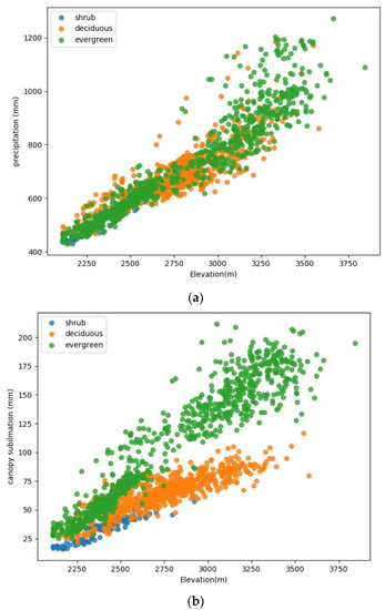 Figure 9 shows that annual precipitation increases with increased elevation, and the canopy sublimation increases with increased elevation, precipitation, and forest density, determined by the LAI, canopy cover, and canopy height of different forest types (
