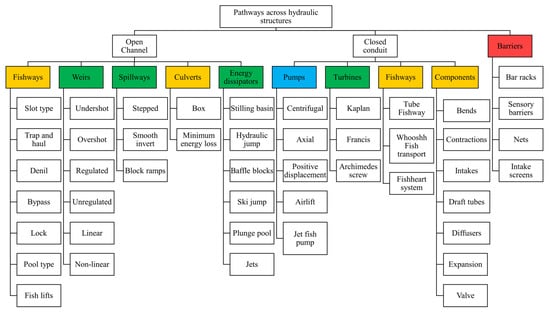 Main pathways for fish across hydraulic structures can be divided into open-channel flows and closed-conduit systems, while barriers prevent fish passage. Fish may move downstream (green), upstream (blue), both ways (orange) or they cannot pass (red).