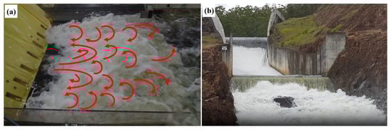 The hydraulics of open-channel flows are well understood [,]. They are omnipresent in natural water systems. When a hydraulic structure is built within a natural system, the flow conditions often remain as open-channel flow. Weirs and other structures can rapidly change flows from slow subcritical flows to supercritical flows characterised by shallow depth with high velocities. Along spillways, high-velocity flows can cause self-aeration, while the energy of supercritical flows downstream of spillways and undershot weirs is often dissipated by violent flows in hydraulic jumps.