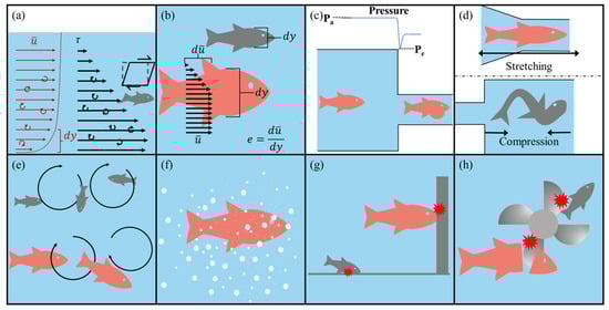 Acceleration or deceleration occur with velocity change in closed-conduit or open-channel flow systems (Figure 3d). In an accelerating flow (e.g., a pipe contraction), the tip of a fish may experience a higher velocity compared with its tail and the fish may be stretched []; in a decelerating flow (e.g., a sudden pipe expansion), fish may compress (Figure 3d). Accelerations and decelerations are closely linked with variations in hydrodynamic properties including shear stress, strain rate, pressures (as mentioned above), as well as flow turbulence.