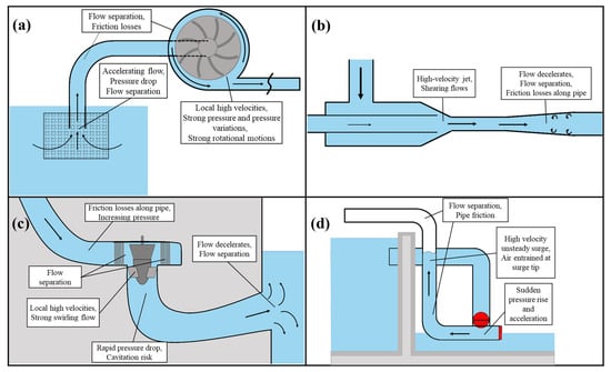 Pressure changes occur due to changes in water depths or from abrupt cross-sectional changes in closed-conduit flows (e.g., sudden contraction) (Figure 3c) or in open-channel flows (e.g., flows around baffle blocks in stilling basins). Significant pressure changes harming fish are quick (seconds or less), faster than a fish can accommodate []. The ratio of pressure changes (RPC) is commonly used to describe the magnitude of this hydrodynamic effect for fish as RPC = Pa/Pe []. Pa is the acclimation pressure (i.e., the pressure that a fish would naturally experience at a certain water depth (e.g., Pa ≈ 111 kPa at 1 m depth)), and Pe is the exposure pressure (i.e., the minimum/maximum pressures experienced along a system for decompression/compression, respectively). Conceptually, there can be sudden pressure loss through a pipe entrance with associated Pa and Pe (Figure 3c). All these parameters represent time-averaged pressures, while pressures fluctuate in turbulent flows. Irrespective of this, the consideration of time-averaged pressures allows simple estimates of pressure drops across hydraulic systems.