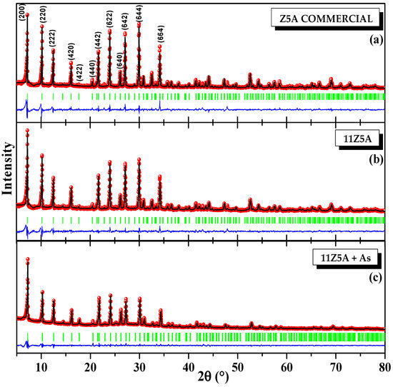 Rietveld refinement performed to commercial zeolite type 5A (a), synthesized zeolite 11Z5A before (b) and after the As(V) removal (c) samples using the Fullprof Suite software. Experimental diffractogram, red lines (Iobs), calculated diffractogram, black lines (Ical), and the residual lines (Iobs − Ical) are shown in blue, and the Bragg’s reflection positions are given in green lines.
