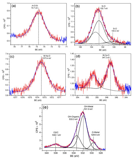 XPS spectra of sample 11Z5A, showing the deconvoluted peaks of (a) Al 2p, (b) Si 2p, (c) Na 1s, (d) Ca 2p, and (e) O 1s. Red lines represent experimental data, blue line the fit curve, and black lines represent the fit components.