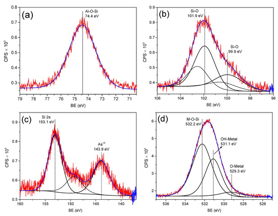 XPS spectra of the sample 11Z5A-As, showing the deconvoluted peaks of (a) Al 2p, (b) Si 2p, (c) As 3p, and (d) O 1s. Red lines represent experimental data, blue line the fit curve, and black lines represent the fit components.