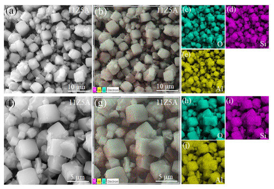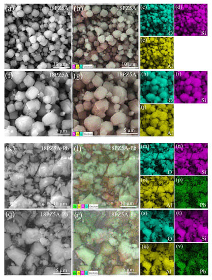 Figure 7a,f show that the characteristic regular cubic shape for 18PZ5A exhibited mean edge sizes from 2.4 to 4.8 µm. Their respective EDS mapping, Figure 7b,g, and elemental EDS mapping images, see Figure 7c–e,h–j, show the presence of Si, Al, and O as major constituents. When adsorbing Pb, polyhedral geometries are observed (Figure 7k,l,q,r) where irregular shapes are adopted with sizes up to 5 µm, and Al, Si, Pb, and O elements were observed in Figure 7m–p,s–v and Figure S1. The content of Pb adsorbed was found to be 4.1 %wt (See Table S1). In this case, the Pb adsorption procedure exhibited a change in the morphology as well as in the structure, which was significantly affected, as can be seen in Figure S3.