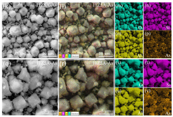 Figure 4a,f show that the characteristic regular cubic shape for 11Z5A exhibits a mean edge size of 3.8 µm. Their respective EDS mapping, Figure 4b,g, and elemental EDS mapping images, Figure 4c–e,h–j, show the presence of Si, Al, and O as major constituents. When adsorbing As, polyhedral geometries are observed, as can be seen in Figure 4k,l,q,r, where irregular shapes are adopted, with sizes between 3 and 8 µm. Si, Al, O, and As were found to be the main elements in Figure 4m–p,s–v and Figure S1. The content of As adsorbed was found to be 2 %wt (See Table S1). Despite the adsorption procedure exhibiting a change in morphology, the structure is not significantly affected, as proved by Rietveld refinement.