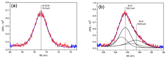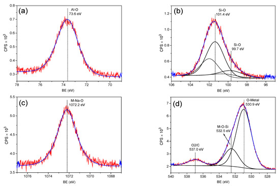 XPS spectra of sample 18PZ5A, showing the deconvoluted peaks of (a) Al 2p, (b) Si 2p, (c) Na 1s, and (d) O 1s. Red lines represent experimental data, blue line the fit curve, and black lines represent the fit components.