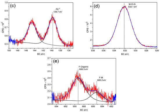 XPS spectra of the sample 18PZ5A-Pb, showing the deconvoluted peaks of (a) Al 2p, (b) Si 2p, (c) Pb 4f, (d) O 1s, and (e) F 1s. Red lines represent experimental data, blue line the fit curve, and black lines represent the fit components.