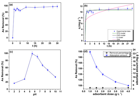 A few metals are essential for some living beings, but if they exceed certain concentrations, they become toxic [1]. Among them is arsenic (As), which is known as a very dangerous and toxic contaminant present in water bodies, and which is being consumed by humans in drinking water and through water used to irrigate crops. The compounds of As are odorless and tasteless, making it impossible to detect their presence in water and food. Therefore, water pollution with arsenic is a current problem faced by many countries in the world, since it can cause damage to health by prolonged consumption of water at concentrations greater than the 0.01 mg L−1 limit recommended by the World Health Organization (WHO). This can cause chronic intoxication, and the most common effects are skin cancer and skin lesions. Moreover, it causes liver and kidney diseases, cardiovascular disease, diabetes, neurotoxicity, and developmental problems [2]. As is found in water effluents with a valence state of +3 and +5, as As(III) trivalent state, or arsenite, and As(V) pentavalent state, or arsenate. Arsenite is the state with greater mobility in the medium and which presents greater affinity to proteins; hence, it is more toxic than arsenate [3]. In reducing environments, predominantly in groundwater, arsenite transport is allowed; on the other hand, in oxidizing environments typical of free aquifers, such as surface water, arsenate is transported. Removal of As(III) by adsorption, ion exchange, or other treatment technologies is difficult, but As(V) at pH 4–6 can be removed by a variety of adsorbents or other chemicals [4].