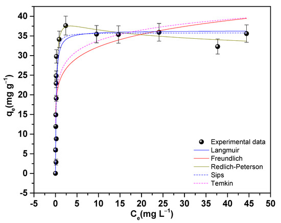 Finally, knowing the equilibrium time and optimum pH, the maximum adsorption capacity was determined. The adsorption isotherm experiments were carried out by varying the concentrations in a range from 5 to 60 mg L−1, using a dose of 18PZ5A adsorbent of 1 g L−1, under constant agitation at 200 rpm at RT.