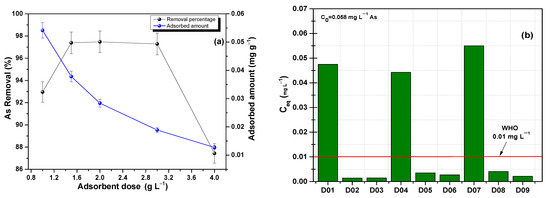 The purpose of the dose effect was to find the highest adsorption percentage in which the amount of adsorbent matches the amount of As ions. The process consisted of varying the adsorbent dose in the range of 1 to 4 g L−1, working with 50 mL of drinking water, at optimum pH, optimum time, agitated at 200 rpm, and at RT. After the adsorption process, the samples were filtered.