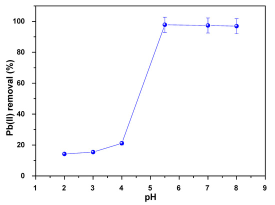 For the following removal experiments, irrigation water was required, and the Pb(II) concentration was increased from 0.018 mg L−1 to 56.35 mg L−1 by dilution from a stock solution of Pb(II) 1000 mg L−1.