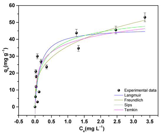 Finally, to determine the maximum adsorption capacity, experiments were carried out by varying the concentration of As in the drinking water from 3 to 80 mg L−1. From the previous experiments, optimum time, pH, and adsorbent dose were defined. The experiments were performed with 50 mL of contaminated water, agitated at 200 rpm at RT, and after agitation, the samples were filtered. The results aim to obtain an adsorption model and study its nature according to the best fit to the Freundlich, Langmuir, Redlich Peterson, Sips, and Temkin isotherm models.