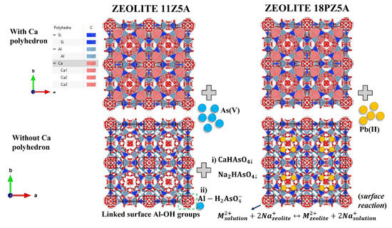 Adsorption mechanism for As(V) (left) and Pb(II) (right) using zeolite 11Z5A and zeolite 18PZ5A.