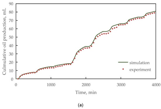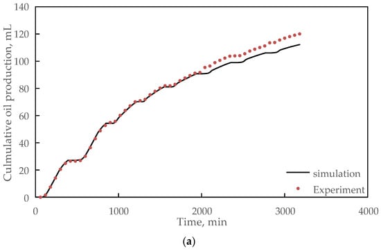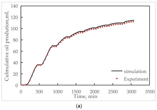 Taking the cumulative oil production and water production of the one-dimensional superheated steam experiment as the matching targets, the matching was carried out by mainly adjusting the relative permeability curve and kinetic parameters, such as activation energy and frequency factor in the developed numerical simulation model. As shown in Figure 3, Figure 4 and Figure 5, the simulated cumulative oil production and water production were consistent with those obtained by experiments. The average absolute errors between the measured and simulated cumulative oil production were 1.79%, 6.58%, and 2.37%, respectively, and those of cumulative water production were 4.55%, 2.03%, and 2.90%. All the results indicated that the measured and simulated liquid production had good consistency and the developed model can accurately predict oil production during huff and puff processes. Therefore, the calibrated parameters were used to predict oil production in the following reservoir numerical simulations.