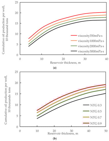 Combined with the classification of undeveloped reserves, the statistics of key geological reservoir parameters affecting steam injection development are shown in Table 6. Two methods were adopted for the analysis of the main control factors: the first method was to use the CMOST module in the reservoir numerical simulation software CMG to conduct sensitivity analysis and establish the influence chart of the main control factors. The analysis results of the main control factors are shown in Figure 12. It can be seen from Figure 12 that the main controlling factors of single sand body reservoirs are reservoir thickness and oil viscosity. The main controlling factors of layered reservoirs are the net-to-gross ratio and reservoir thickness. The main controlling factors of the thick layer of extra and super heavy oil reservoirs are reservoir thickness and water energy.