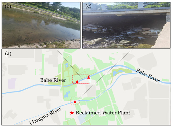 (a) The location of the sampling sites (the map resources from www.amap.com (accessed on 24 August 2022)); (b) photograph of the river water sampling sites; (c) photograph of the reclaimed water sampling sites.