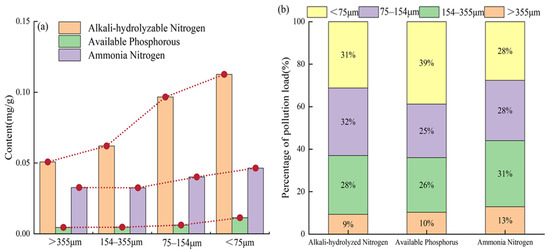 The content of nitrogen and phosphorus pollution loads in the sediments of different particle sizes is shown in Figure 2a. It should be noted that the smaller the sediment particle size, the higher the content of nitrogen and phosphorus nutrients per unit mass. Sediments with particle sizes smaller than 75 μm exhibited the highest pollution load of alkali-hydrolyzable nitrogen, available phosphorus and ammonia nitrogen with percentages of 0.112 mg/g, 0.011 mg/g and 0.046 mg/g, respectively. These results are in agreement with a previous study [26]. At a smaller particle size, the specific surface area is larger, which should provide a greater adsorption capacity for nitrogen and phosphorus [27].