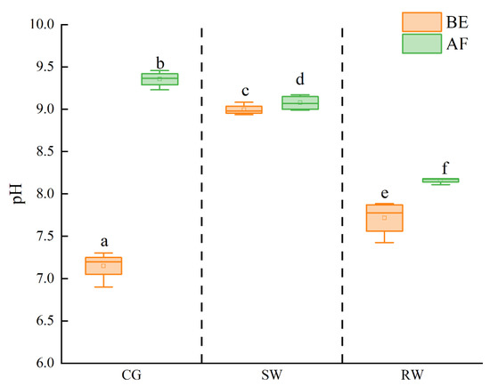 Figure 3 shows the pH variation in the three types of water bodies before and after the addition of the sediment (denoted as BE and AF, respectively). It should be noted that the highest pH was recorded for SW before the addition of the sediment and that the pH of the RW was higher than the CG. This may be attributed to a depletion of due to photosynthesis by phytoplankton in the RW [14]. After the addition of sediment, the pH of the three water bodies all increased. The starting pH of the CG was 7.1 ± 0.2, which was raised to 9.3 ± 0.1 following the inclusion of the sediment. In the case of the SW, the pH was increased from 8.9 ± 0.1 to 9.0 ± 0.1, while the increase in the pH of the RW was from 7.6 ± 0.2 to 8.1 ± 0.1 due to the sediment addition. The final pH followed the sequence CG > SW > RW, which is consistent with the research results reported by Hou et al. [10]. Compared with the CG, the pH variation in the case of the SW and the RW was significantly smaller. According to previous studies, this response can be ascribed to the presence of various ions in river water and reclaimed water that are formed by different acid-base buffer systems, such as carbonate, sulfate and Al(III) buffers, which played a role in buffering possible pH changes in water [29].