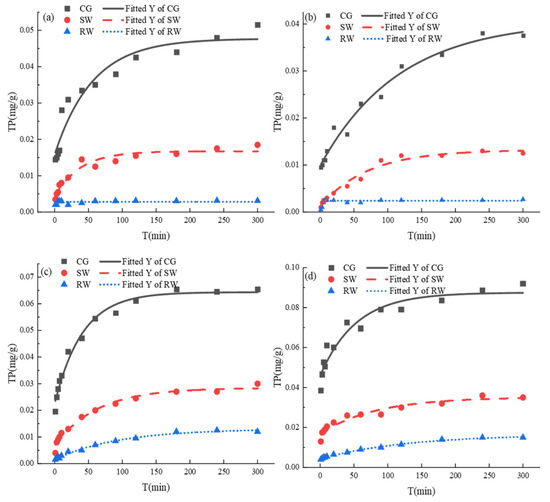 The relationship between TP release in different water bodies and pipe sediment particle sizes is shown in Figure 4. Initially, due to the large gap in TP concentration between the sediments and the accommodating waters, the TP release showed a marked increase, and, at extended reaction times, the release rate decreased to reach a plateau value representing equilibrium after 120 min. As illustrated in Figure 4a–d, it should be noted that at equilibrium, the amount of TP released was higher in every case for the CG when compared with SW and RW. The amount of TP released in the CG was 1.06–1.56 times that of the SW and 1.23–2.44 times that of the RW. The results indicate that TP release was inhibited in both the SW and RW but especially in RW, which exhibited the lowest release (0.002 mg/g).