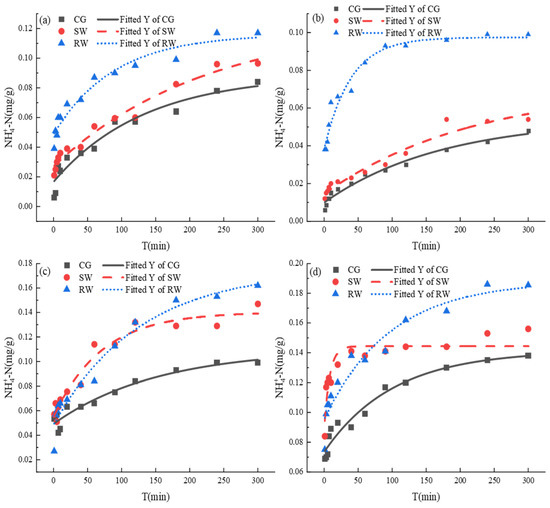 The release kinetics of -N from pipeline sediments with different particle sizes in different water bodies are presented in Figure 5. The release process of can be divided into two stages: a fast reaction and a slow reaction. The amount of released gradually approached an invariable value with increasing reaction time. The released (0.0188 mg/g) in RW from the pipeline sediments was higher than that in SW and the CG, as shown in Figure 5d. The release of in SW was also higher than that in the CG. This indicates that the release of in particulate matter was promoted in SW and RW, and the greater release of in RW can be linked to the lowest pH in RW. When the pH was raised to 7.0, it exceeded the zero charge of the submerged mud colloid, rendering the surface of the particulate matter negatively charged. The higher the pH, the more favorable the adsorption of particulate matter , thus inhibiting the release of into the surrounding water. At the same time, at the lower pH competes strongly for in the mud colloid and contributes to desorption. It has also been shown that there is a large amount of organic matter in the reclaimed water and river water, and the organic matter in the water can have adsorption competition behavior with , thus weakening the adsorption capacity of particulate matter on [33].