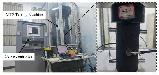 For experiments on the compressive strength of the coal samples, a universal testing machine (MTS) was used for servo loading, as shown in Figure 1.