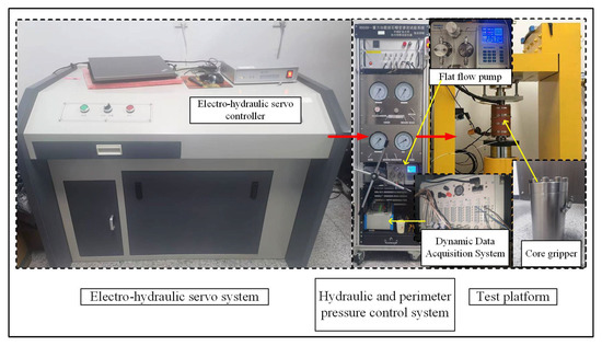 In the triaxial compression percolation experiment on coal samples, a gravity-loaded rock percolation test platform from the China University of Mining and Technology was used, which consists of six systems, namely the load-bearing system, loading system, temperature control system, percolation system, measurement system, and automatic acquisition control system. In the loading system, the axial load σ1,max = 150 MPa, radial load σ2,max = σ3,max = 25 MPa, and pressure upstream of the liquid seepage in the seepage system pw,max = 20 MPa. The equipment can conduct triaxial rock mechanics experiments under different stress paths, seepage experiments, and data acquisition using high-precision sensors and other equipment. The seepage flow experimental equipment is shown in Figure 2, and a schematic of the equipment is shown in Figure 3.