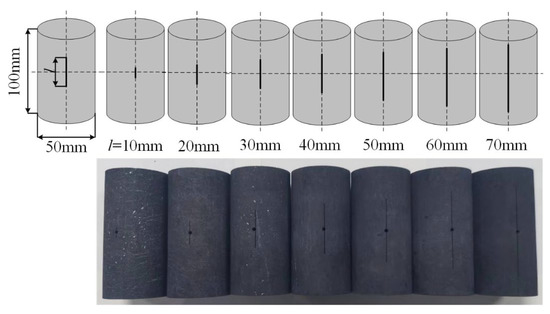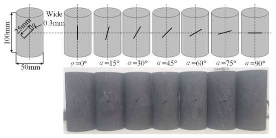 According to the standard cylindrical specimens of ϕ ≤ 50 mm and H ≤ 100 mm recommended by the International Society of Rock Mechanics (ISRM) [19], this experiment processed the coal samples into cylindrical specimens of size ϕ = 50 mm and H = 100 mm along the coal seam joints during processing and polished and sanded the cylindrical coal samples. The surface of the specimen is polished and sanded to achieve the desired flatness and roughness. In case of specimens requiring pre-fracturing, wire-cutting techniques were used to pre-fracture the specimens. Seven different lengths and seven different inclination angles of single fracture were prefabricated with a single fracture width of 0.3 mm, and the rest of the geometry was characterized by the parameters l and α. The values of l were 10 mm, 20 mm, 30 mm, 40 mm, 50 mm, 60 mm, and 70 mm, and the values of α were 0°, 15°, 30°, 45°, 60°, 75°, and 90°, respectively, as shown in Figure 4 and Figure 5.