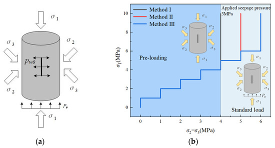 The specimens were completely water-saturated using a non-destructive water immersion device. A gravity-loaded rock seepage test rig was used for pre-loading with stress-controlled loading and simultaneous application of axial stress σ1 and radial stress σ2 and σ3 at a rate of 1 MPa/min, followed by displacement-controlled loading with axial stress σ1 applied at a rate of 0.01 mm/min and simultaneous application of radial stress σ2 and σ3 to achieve experimental standard loading conditions. When axial stress σ1 and radial stress σ2 and σ3 are stable, the percolation pressure pw is applied via a level flow pump using a constant flow mode of 5 mL/min controlled by pressure. After all the stresses have stabilized, the seepage experimental data collection is started. The stress paths are shown in Figure 6.