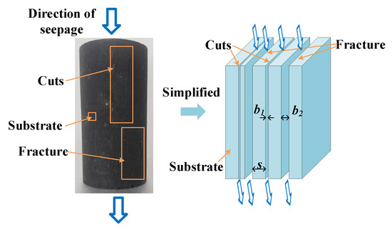 The model assumes that when seepage occurs in a coal sample, it occurs mainly along the cuttings and fractures in the coal sample. The cuttings and fractures divide the coal sample matrix [22], as shown in Figure 1. Ideally, the split widths of the cut and fracture are b1 and b2, respectively. In the cubic law, the flow through the cut or fracture can be expressed as